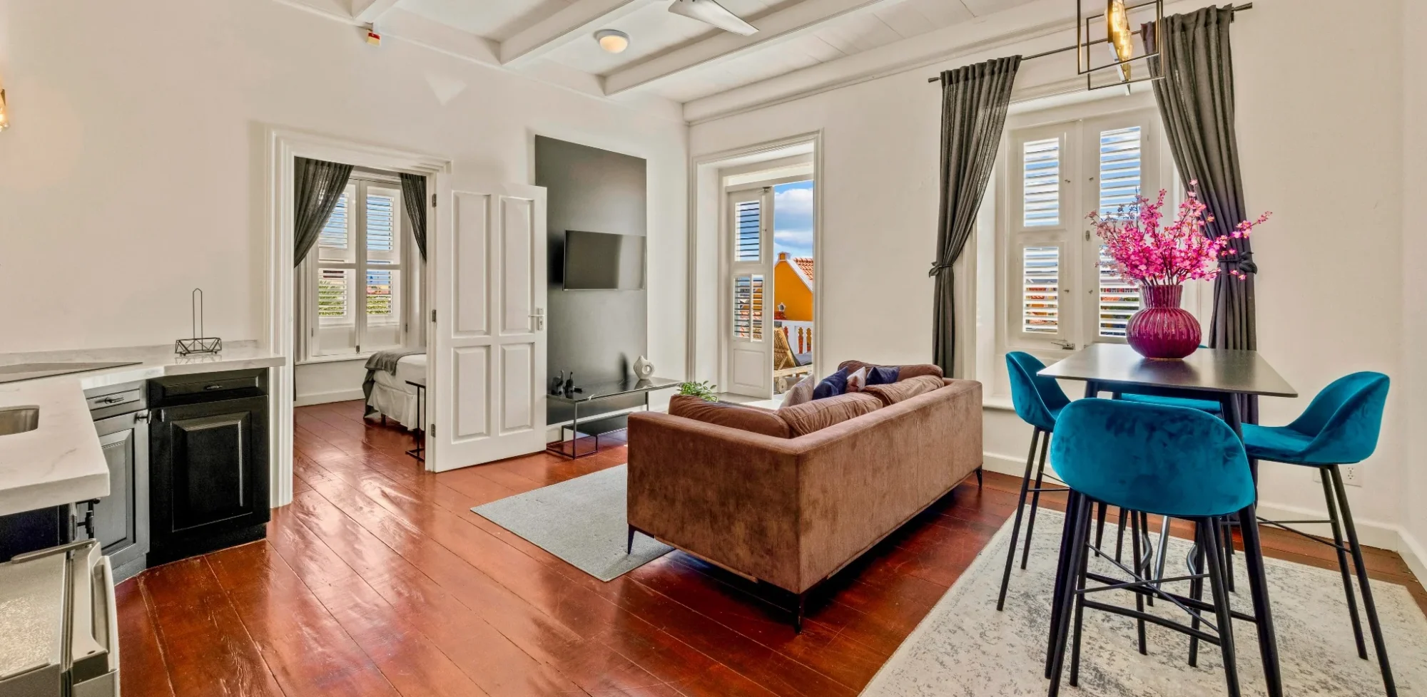 Experience the Atelier Superior One Bedroom Suite with Kitchen at Atelier Skalo Boutique Hotel, a sophisticated retreat on the first floor of our restored 18th-century mansion. Bathed in natural light, the suite opens onto a private terrace with views of the water, city, and pool, inviting you to relax and unwind. Inside, a fully equipped kitchen, separate living and dining areas, a king-size bed with premium linens, air conditioning, ceiling fan, and flat-screen TV combine style and comfort for a truly elevated stay. Perfectly positioned heart of Willemstad, this suite offers a serene, boutique setting ideal for extended stays, a leisurely escape, or romantic vacation.